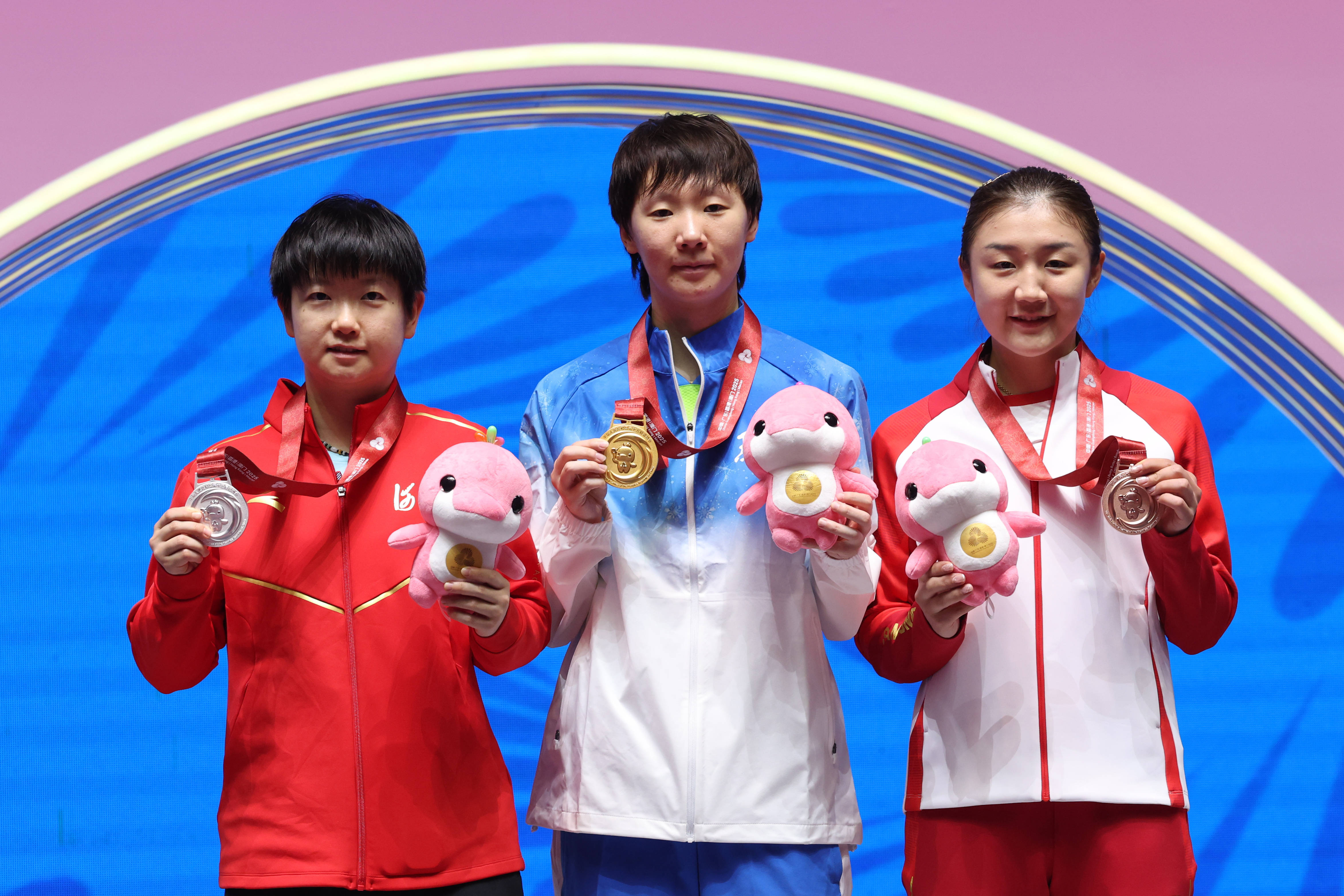 11月16日,冠军黑龙江队选手王曼昱(中)、亚军河北队选手孙颖莎(左)和季军山东队选手陈梦在授奖庆典上合影。新华社记者 梁旭 摄射箭式样首金来自一位信得过的“黑马”。20岁的湖北小将宗钰一齐淘汰李佳蔓、黄雨薇等国度队箭手,夺得女子反曲弓个东谈主金牌。“不要想太多”,赛后采访中,她用一句简便的话,证明注解了我方惊艳的爆发。